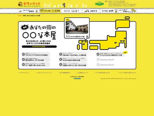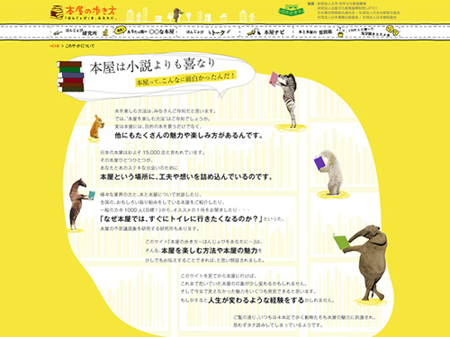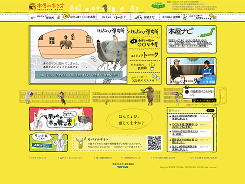 本屋の歩き方「ほんじょび」 by t.tsuzukiPosted on2010年8月25日2018年2月7日 本の楽しみ方を紹介するのではなく、本屋の楽しみ方や魅力を伝えるために制作されたサイト。このサイトを見てから本屋に行けば、これまで抱いていた本屋の印象が少し変わるかも・・・だそうですw 全体の色味は黄色?黄緑色?鮮やかな色を使っているのに目に優しい感じのする微妙な色が使用されています。そこに出現する四足歩行している動物達。読んでますね、本を。 全国の本屋さんを検索できるようです。