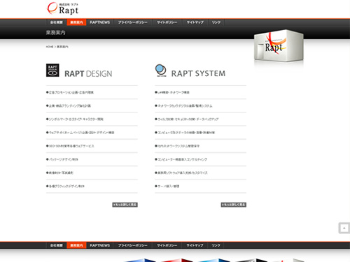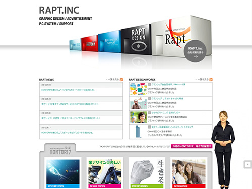 株式会社ラプト by t.tsuzukiPosted on2010年8月25日2018年2月7日 静岡に拠点を置き、東京までブランディング・クロスメディア・ホームページ制作・ロゴ制作・広告企画の行う制作会社。制作だけではなく、LAN構築・ネットワーク構築・ネットワークカメラ・ウィルス対策・セキュリティ対策などのシステムも構築しています。 サイトトップの箱をそれぞれ事業サービスとして、それぞれをクリックするとガラッとサイトのイメージが異なります。 さすがシステムにも強い会社。サイトを開くとスタッフが動画で表示され、会社概要などを紹介してくれます。