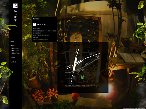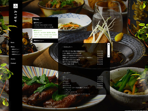 みつばち by t.tsuzukiPosted on2010年9月10日2018年2月7日 東京の自由が丘にある、お昼はお蕎麦、夜は居酒屋の和風ダイニング「みつばち」のサイト。フルフラッシュで制作されています。全体のサイトカラーがブラックですが、デザインや使用されている写真が清潔感を漂わせています。 ランチメニューや夜の居酒屋メニューもあり、背景に見える様々な料理の写真が食欲をそそります。メニューはテキストのみでリストで表示されているんですが、それぞれの料理の写真が見たいなぁ・・・。 雰囲気あるサイト。サイトでお店の雰囲気を表現するのは難しいと思いますが、良い感じで出てますよね。