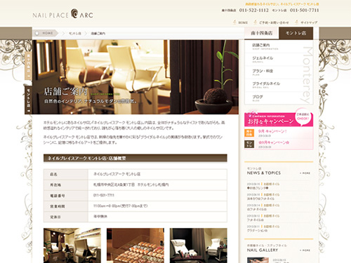 札幌の中央区にあるエステのようなネイルサロンの「ネイルプレイスアーク」。ジェルネイルやネイルアートに定評があるそうです。とにかく豪華でキレイでパッと見の印象がすごいです。豪華な感じを出す際に、よくゴールドっぽい色味を使ってデザインをするのですが、それほどゴールド感はないのですが、優しい感じの豪華さが表現されています。とくにトップページで使用されている大きめな画像。これが目をひきますね。これはフラッシュではなく、Javascriptで実装されています。