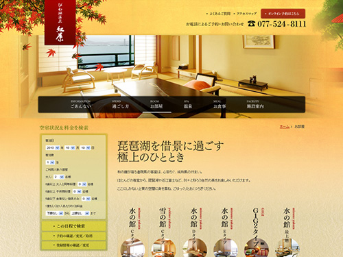 滋賀県にある、「びわ湖温泉 紅葉」さんのサイト。まるで金屏風をイメージさせるようなキレイなサイトです。琵琶湖の畔に佇む純和風旅館で、王朝文化漂う雅な空間の中、天然温泉、美味しいお料理、くつろぎの客室、そして心からのおもてなしを提供してくれるそうです。