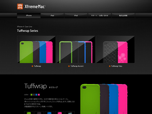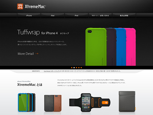 XtremeMacブランドのiPhone、iPod、iPadケース、アクセサリ製品に関する情報を紹介しているサイト。アップル製品に関する商品のみを取り扱い、紹介しているサイトなので、サイトデザインの雰囲気がアップルのサイトに似ていますね。ページ上部にある大きめのメニューボタンは、注目されやすい感じに制作&配置されているので、何に関する商品の情報が欲しいのか、すぐに見つけることができます。