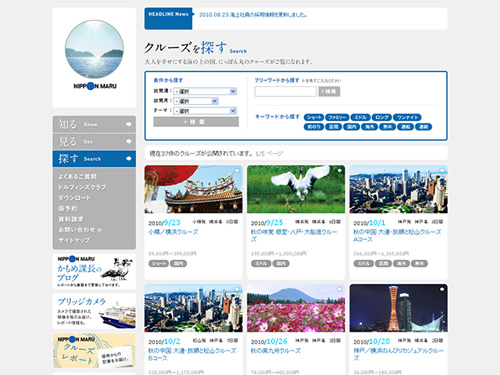 旅行系のサイトだと、掲載したい内容や旅行業法などによる掲載必要事項など、たくさんありますが、にっぽん丸 オフィシャルサイトでは、それらの情報がキレイに整頓されて紹介されています。ユーザビリティーがとても高く、サイトデザイン自体もスッキリとしているので、見やすく良いサイトです。