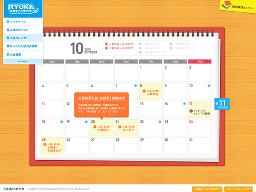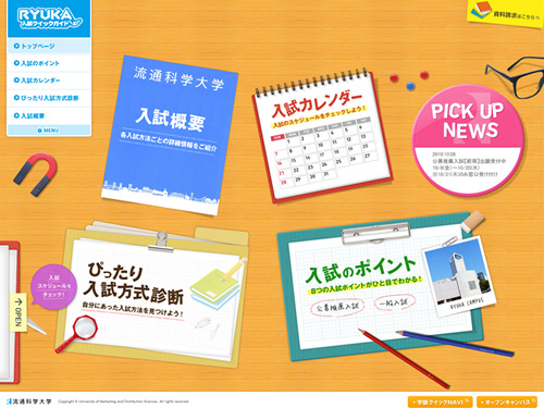 2011年度の流通科学大学入試クイックガイドのサイトです。公募推薦入試、一般入試に関するいろんな情報を掲載しています。サイトについてよりも、まず最初に、最近では学校サイトのクオリティーがかなり向上しています。今回紹介する流通科学大学さんも、2011年度の入試のためだけに、この素晴らしいフルフラッシュで制作されたコンテンツウェブサイトを用意しています。さすが流通科学の大学ですね。