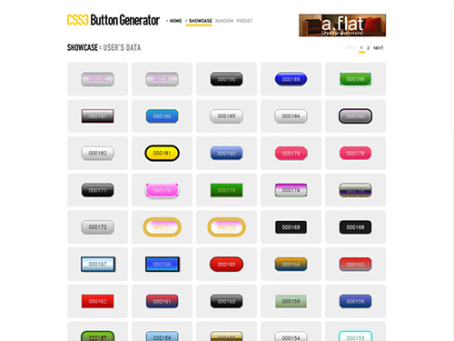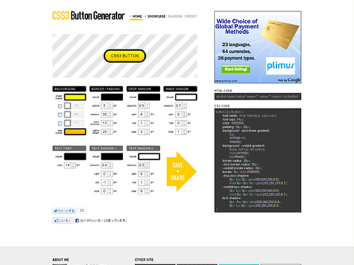 実際にブラウザ上で、背景色やボーダーなどのパターン、ドロップシャドウに関する数値を入力するだけで、出来あがったボタンを目で確認でき、それを自分のサイトに表示させるためのcss3を自動的に形成してくれる、優れものサイトです。
