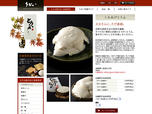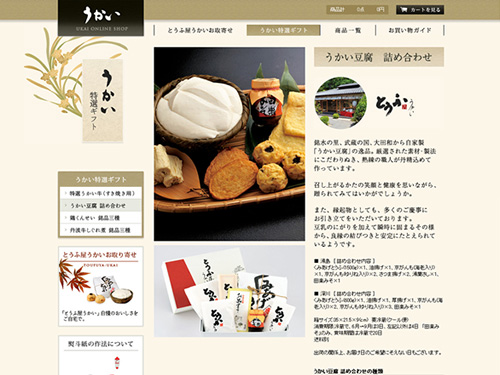 以前、紹介した「うかいオンラインショップ」が完全リニューアルしたそうです(2010年9月13日の紹介)。前回は「とうふ屋うかい」さんとしてお豆腐やさつまあげ、厚揚げ、湯葉などを紹介、ネット販売されていました。こんな↓感じです。