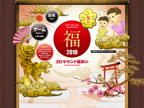 ルフトが制作した2010年年賀コンテンツ「3Dサウンド福笑い」のサイト。液晶テレビや映画館など3Dがキーワードとなって普及しつつありますが、これはサイトが3Dになっています。ただし、この3D、昔懐かしい赤と青のフィルムがはられたメガネで閲覧する古~い方式の3Dサイトですw