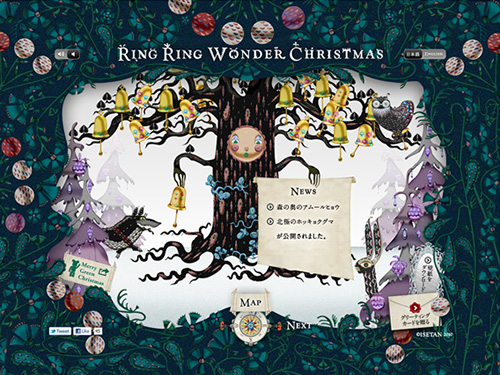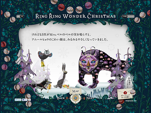 伊勢丹が制作したクリスマスキャンペーンサイトです。ここは不思議な動物たちが住むワンダーエデン。ここに住むウサギ、オオカミ、フクロウの3匹の耳に今年もミセス・ベル・ツリーのベルの音が届きました。3匹は、毎年ミセス・ベルのベルの実を集めては世界中にクリスマスの訪れを知らせに行きます・・・。という設定で、2010年のクリスマス向けにサイトが公開されています。
