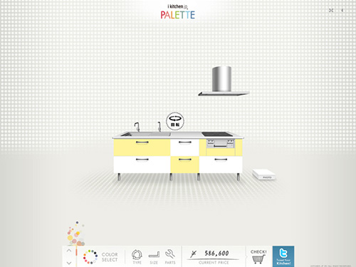 そして、こんな↑感じで作れちゃいました。操作方法も簡単で、説明なくても色が塗れちゃいました。値段も出てきますし、さらにTwitterとも連動していて、他の人と共有することもできます。人気ランキングなどあると、良いですね。あと、実際に出来上がった参考キッチンなんかもあると、色選びに一役かうかと思います。