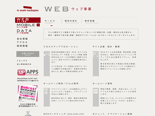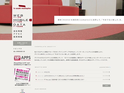 テレビ朝日メディアプレックスさんのサイト。WEBサイト、モバイルサイトの企画・設計・構築、クロスメディアプロモーションやWEBマーケティング企画などを行っており、特にオンラインメディアを中心に、媒体(media)を複合的(complex)に活用し、「今までにない楽しさ」を提供している・・・ということで、メディアプレックスという名前なんですね。