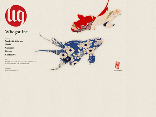 WEB(ウェブ)システム、サービスを企画・開発から運用までご提供する、WEBサービス会社の株式会社風雅(Whogot Inc.)さんのサイト。かなり「和」な感じの雰囲気漂うデザインのサイトです。カッコよく、キレイに金魚のイラスト・写真を使っているサイトは、とても和の雰囲気が出ていて良いですね。