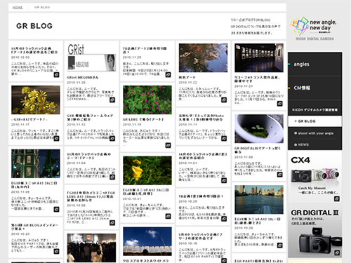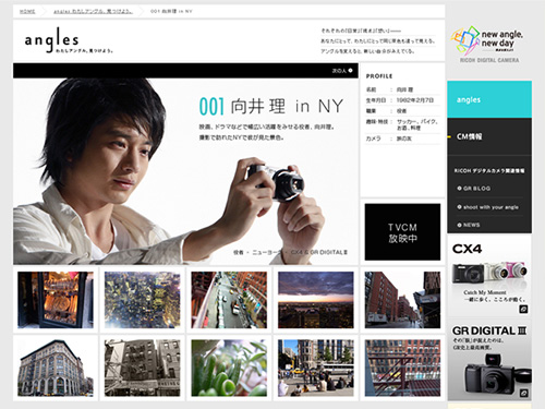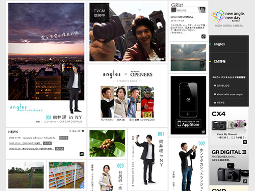 独自の視点で世界を動かす表現者たちのNEWプロジェクト、new angle, new dayのサイト。RICOH(リコー)の最新デジタルカメラの「CX4」、「GR DIGITAL III」、「GXR」のキャンペーンサイトとして制作されたサイトですが、最近CMでもよく見かけますね。