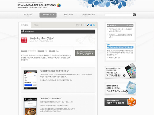 サイトデザインも見やすく、白&グレーが基調になっていて、そこに青色系の挿し色でゴシック系のデザインが施されています。アプリもiPhoneやiPadで大きく分けられ、さらに細かくカテゴリ分けされています。カテゴリの横についているアイコンもカッコイイですね。検索能力としても、かなりユーザビリティーの高いサイトではないでしょうか。