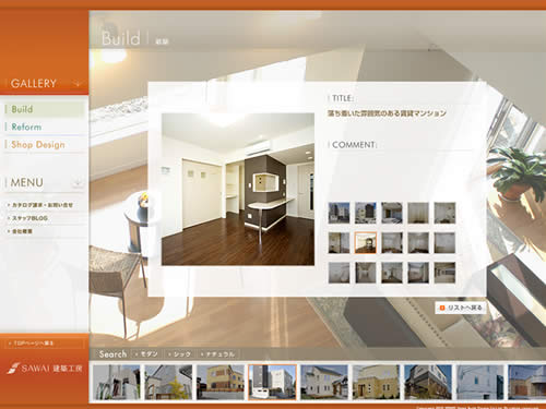 施工事例と新築(Build)、リフォーム(Reform)、店舗(Shop Design)というように3つの大きいカテゴリに分けて紹介しています。右側に位置されているメニューをクリックすると、こんな↑感じに一覧が表示されます。マウスの位置によって、施工事例の建物が左右に動きます。この動き方もスムーズなんです。
