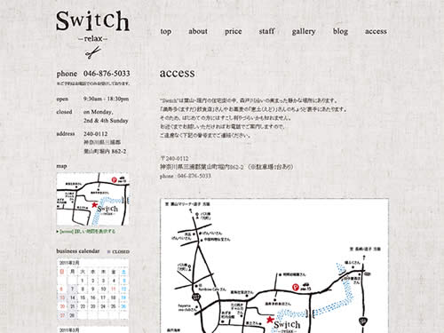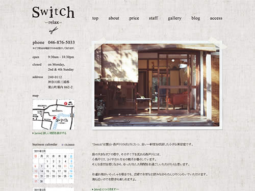 葉山の森戸海岸の近く、堀内にある古い一軒家を改装した小さな美容室「Switch relax」さんのサイト。庭の大きなタブの樹やすぐ下を流れる森戸川には、リスやカルガモ親子が暮らしていて、そんな自然を感じながらゆったりとした時間を過ごせるようです。一緒に訪れた方やお子様は、広縁でお茶など飲みながらのんびり寛ぎながら過ごすことができるようです。店の名前にもありますが、Relaxできる美容室のようです。