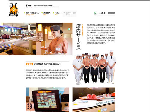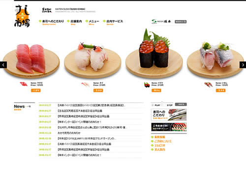 熊本・福岡・宮崎・佐賀など九州全土で展開している回転寿司の「九州すし市場」さんのサイト。動きが楽しい感じです。トップページでは、お皿にのった寿司が左から右へスクロールしながら、クルクルと回ります。回転寿司ならでは、って感じで楽しいですね。この動きは、フラッシュではなく、JavaScriptで動かしています。この面白くて楽しい動きを参考にさせてもらいたいのですが、どんなサイトに使えるのでしょうか・・・w