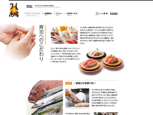 九州すし市場さんの寿司へのこだわりは、こんな↑感じで紹介されています。ただサイトを表示させるのではなく、右から寿司を握っている手がニュッと表示されます。この動きも楽しくて良いですね。