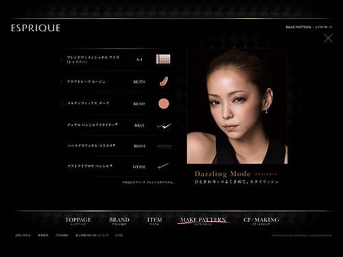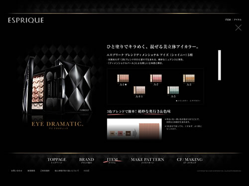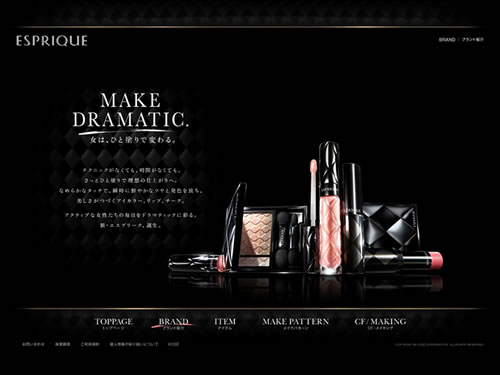 テクニックがなくても、時間がなくても、さっとひと塗りで理想の仕上がりで、アクティブな女性たちの毎日をドラマティックに彩るエスプリークの新しいコスメを紹介するサイト。フルフラッシュで制作されたサイトで、真っ黒な背景が印象的なサイトです。