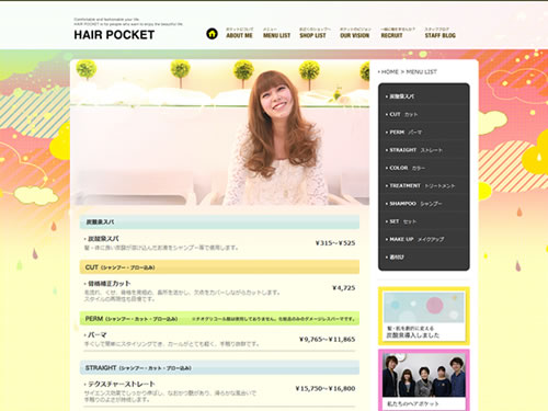 美容院ならではのメニューを紹介するページが、こんな↑感じです。とてもシンプルなメニューで見やすくて良いのではないでしょうか。ただ、トップページと同様で、もう少し美容院をイメージさせるような写真や、イラストを使うと、何のサイトなのか明確になってユーザーに親切なサイトになるんではないでしょうか。
