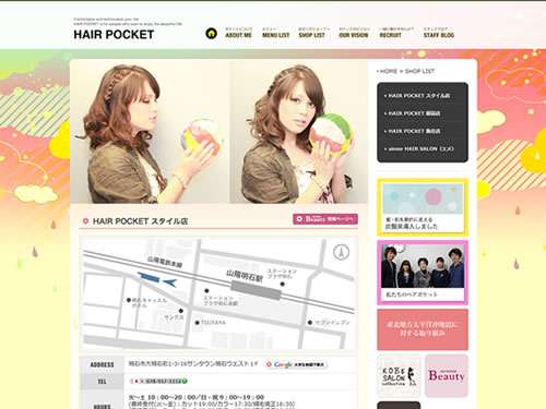 HAIR POCKET(ヘアーポケット)は明石市の美容室で、明石駅、朝霧駅、魚住駅、学園都市駅の合計4店舗あります。なんでも話せるアットホームなヘアサロン、みなさまに愛される美容室を目指しているようです。