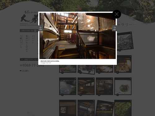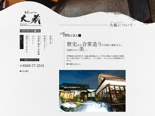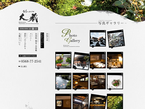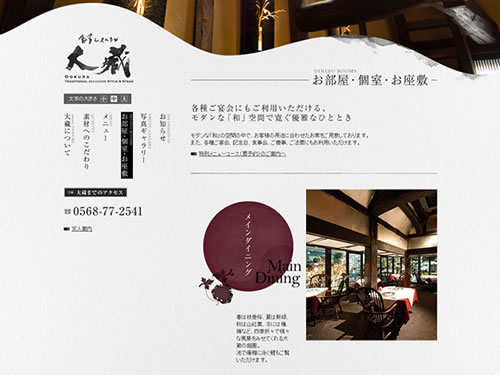 古民家レストランってことで、建物の外観の特徴がすばらしいですね。そんな特徴を損なうことのない和風なサイトデザイン、良い味が出てます。掲載されている写真がどれもキレイで、そのキレイさを際だたせる背景の薄いグレー。雰囲気が出ています。背景のグレーは、墨汁のシミっぽいデザインがあり、そのおかげで和紙のような質感が感じられます。古民家レストランのサイトイメージとして、ぴったりですね。