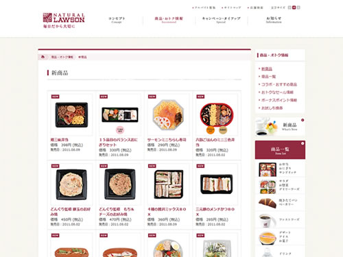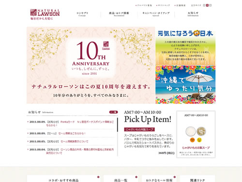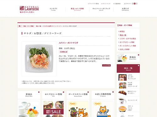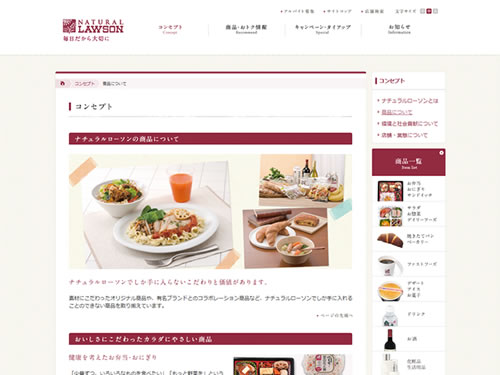 ナチュラルローソンのコンセプトは、こんな↑感じで紹介されています。自然なものと取り扱う体に優しいコンビニエンスストアなので、コンセプトの紹介にはかなり力を入れられていると思います。ページ移動をしているとわかるのですが、かなり表示速度が速いかと思います。cssや画像の加工方法に気を使って、かなりファイルサイズを減らしているのではないでしょうか。