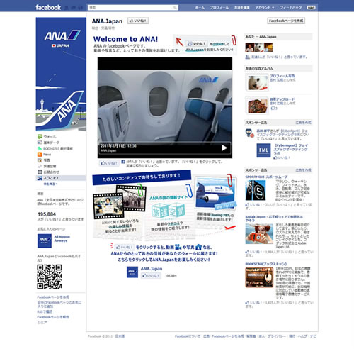 SEO対策やサイト制作時に必要となってきたFacebookのファンページ。ANA Japan(全日本航空)もこんな↑感じで力を入れています。