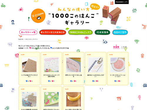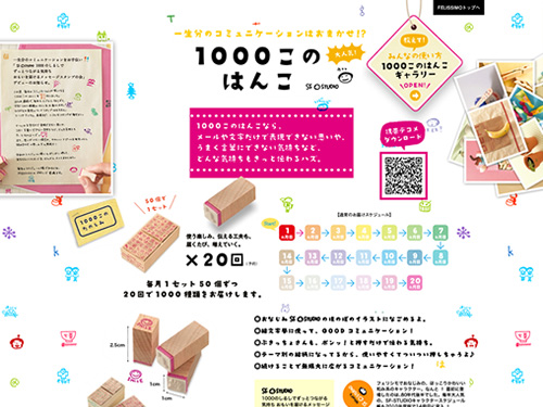 ファッションや子供服から雑貨といった商品のオンラインショッピングを運営するフェリシモが作ったコンテンツサイト「1000このはんこ」。似たような商品で「500色のクレヨン」もあります。この「1000このはんこ」を購入すると、1セット50個のはんこが毎月届けられ、最後20週後には1000このはんこが揃う・・・って感じです。
