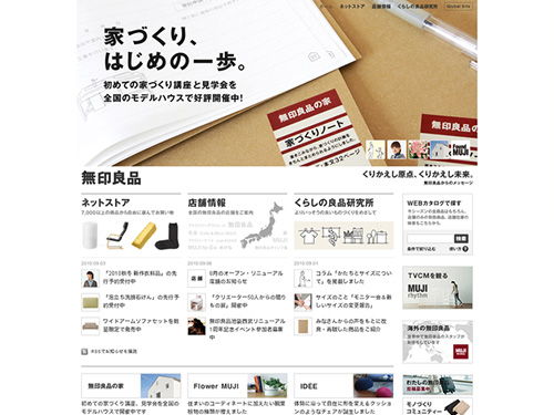 説明する必要ないでしょう、世界各国で人気の「無印良品」のサイト。無印のサイトということもあり、四角くレイアウトされ、コーポレートカラーの黒色と赤紫色でデザインされたキレイなサイト。実際の店舗というか、取り扱っている商品ラインナップとサイトのデザインが同期されてる感じがステキです。