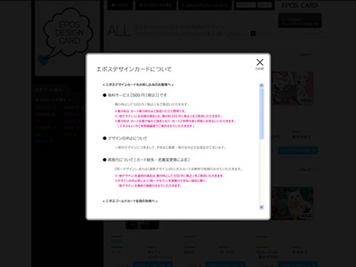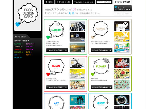 クレジットカードのデザインはカテゴリ別になっていて、好きなデザインがすぐに見つかるようになっています。ただ、このサイトの説明があまりにも少ないので、何のサイトなのか、何ができるのか・・・。そこらの情報をもっと増やすと良いかもしれませんね。