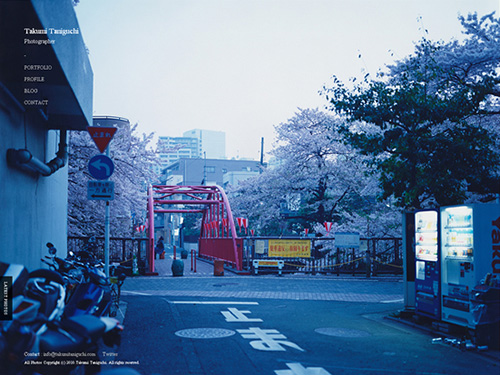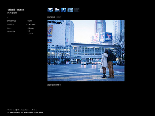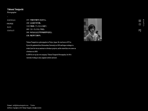 カメラマン「谷口巧」さんの会社、株式会社谷口巧写真事務所のサイト。トップ全面に表示された写真は、もちろん谷口巧さんが撮影された作品です。その写真が順々に表示されます。サイトデザイン的にフルフラッシュで制作されているかのようですが、そうではなくHTMLで構成されたサイトになっています。iPhoneで閲覧した場合でも、同じように表示されますね。