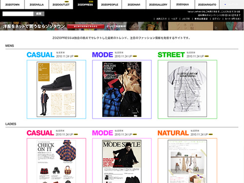 次に紹介するのがこれ↑、「ZOZOPRESS」。ファッション情報発信サイトとして新しく作られました。自由な視点でセレクトされた旬な情報を定期的にピックアップし、紹介してくれます。メンズ、レディースを6ジャンルに分けて、各ジャンルに精通したバイヤーさんやブランド担当者が、毎週気になったアイテムやニュースを紹介してくれます。