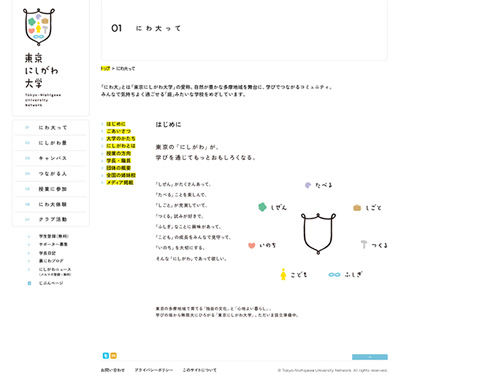 東京多摩地域をフィールドに、街をキャンパスに見立て、誰もが気軽に参加できる「ユニークな生涯学習」を通じて、自由で開放的な「新しいコミュニティづくり」を支援し、多摩独自の「文化の醸成と発信」を見守る活動体「東京にしがわ大学」のサイトです。