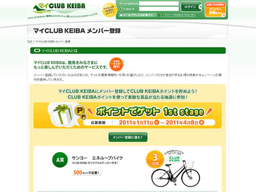 このサイトではマイCLUB KEIBAのメンバー登録することができます。そのメンバー登録のページはこんな↑感じです。キャンペーンサイトはこれだ!という感じのサイトデザインになっていますね。