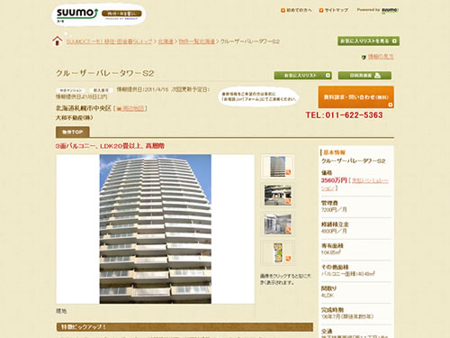 物件詳細は、こんな↑感じ。写真も大きく、掲載点数も十分ではないでしょうか。全体的に隙間が多いようにも見えますが、その隙間が良い感じに使われているので、情報がたくさん掲載されていても、見やすくなっています。